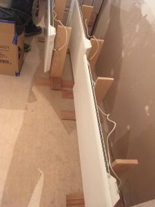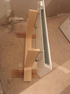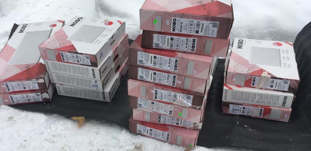 Vi fikk varme fra det norske selskapet NOBO. Vi plasserer ovnene midlertidig på separate stativer; etter å ha malt veggene, setter vi dem på plass.