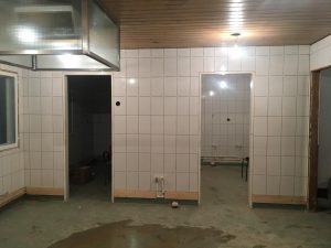 På barnehjemmet er innvendig etterbehandlingsarbeid i full gang; Flisene på veggene er nesten ferdig lagt. Vegger og vannrør repareres.