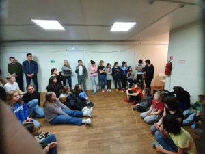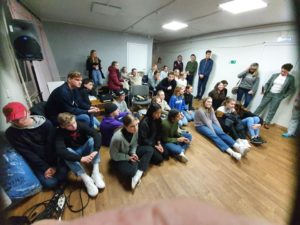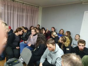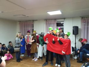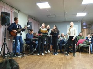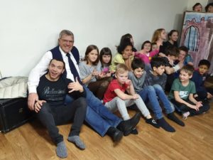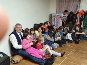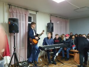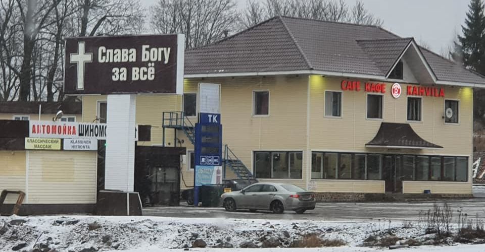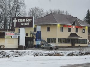 Så er vi i Russland. Helt problemfri grensepassering. Vi nådde innsjekking på hotellet før vi gikk til hjem for Gatebarn. Bildene er fra besøket der. Program av ungdommene våre og barna vi besøkte. Når vi kjører inn til Russland så kommer vi til et skilt ved veien som har denne teksten. På Norsk blir det «Takk Gud for alt» hvordan ville det fungert i Norge i 2020?