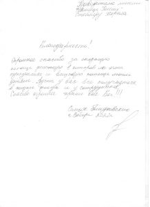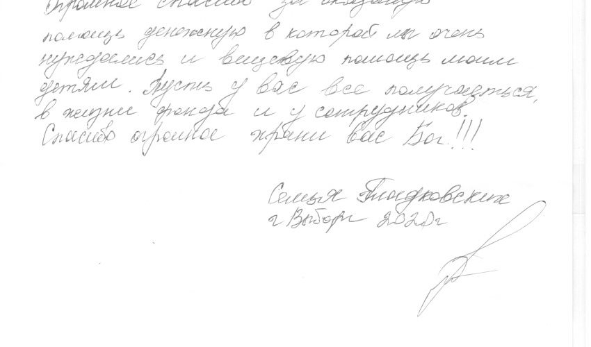 Vi takker deg og det norske folk fra alle våre hjerter for hjelpen du gir oss!!! Russland er et veldig stort land. Rundt i landet lever folk (veteraner, invalide, store familier med flere barn) veldig dårlig, de trenger hjelp hele tiden. Vi takker Herren vår Jesus Kristus for hjelpen som Han har sendt gjennom deg i mange år (takk til det omsorgsfulle norske folk som hjelper). Situasjonen i Russland er for øyeblikket veldig vanskelig og vi ber deg om å fortsette å hjelpe oss i denne vanskelige tiden. Vi er takknemlige til hver nordmann som gir penger for å hjelpe det russiske folket. Må Gud velsigne dere.